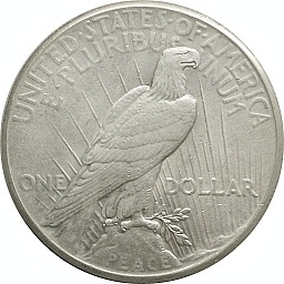 | ドル。自由の女神。デザイナーの名にちなんでモルガンダラーと呼ばれています。大量に発行されたコインで、現存数も多いので、年号別収集が人気です。フィラデルフィアミント。 | ドル。自由の女神。裏面の鷲(アメリカの国鳥・ハクトウワシ)の足下に PEACE の文字が記されていることから、ピースダラーと呼ばれています。フィラデルフィアミント。 | |||||||