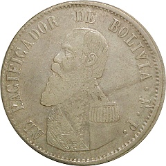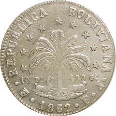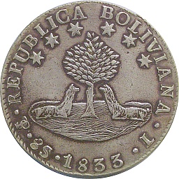 8ソル。ボリバル・月桂冠。裏面に描かれた6つの星は、当時のボリビアを構成する6つの州を表しています。また木の下にたたずむ2頭の動物は、リャマではなくアルパカでした。ポトシミント。 |