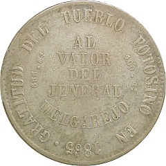 Melgarejo 1865 FP, KM146 Obv. Mariano Melgarejo, Rev. Legend |
