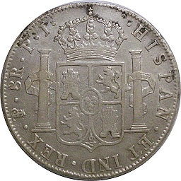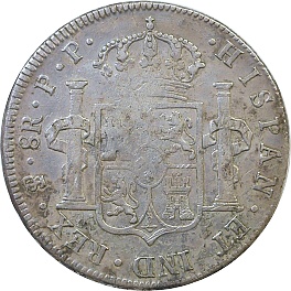 | 8レアル。カルロス4世・月桂冠。植民地時代に発行されたコインで、スペイン国王の肖像が描かれています。裏面に記されたミントマークは、PTSを組み合わせたモノグラムになっています。ポトシミント。 |