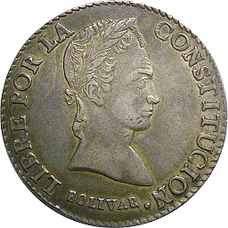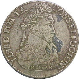 8 Soles 1833 L, KM97 Obv. Bolivar (Military Bust), Rev. Tree and Alpaca |