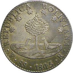 8 Soles 1845 R, KM103 Obv. Bolivar, Rev. Tree and Alpaca |
