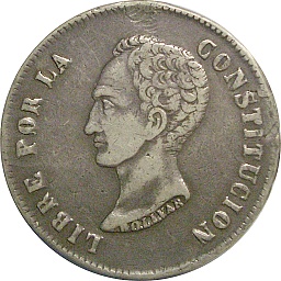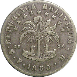 8 Soles 1850 FM, KM109 Obv. Bolivar, Rev. Tree and Alpaca |