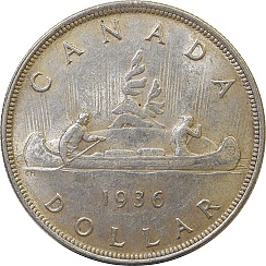 | Dollar 1936, KM31 Obv. George V, Rev. Canadian Canoe |