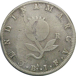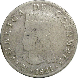 | 8レアル。鷲の羽の髪飾りをつけたインディアンの肖像が描かれています。裏面に描かれているのはザクロ。このコインは、状態のよいものが極めて少ないことで知られています。ボゴタミント。 | ペソ。自由の女神。裏面にはコンドルが描かれたコロンビアの国章とともに、ミントマークではなく鋳造地の地名がそのまま記されています。ボゴタミント。 | |||||||