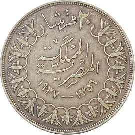 | 20 Piastres 1937, KM368 Obv. Farouk I, Rev. Legend |