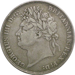 | クラウン。ジョージ4世、月桂冠。これも状態はFですが、クリーニングされていないので歴史的な風格を感じさせてくれます。ロンドンミント。 |