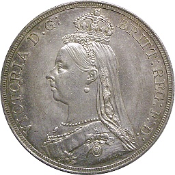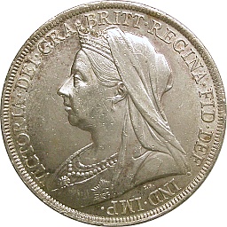 クラウン。ヴィクトリア女王、ベールドヘッド。晩年のビクトリア女王が描かれています。イギリス銀貨の品位は、一般的な0.900より高い0.925(スターリングシルバー)になっています。ロンドンミント。 |