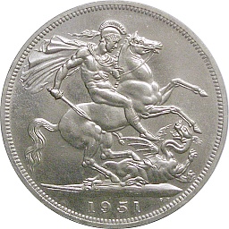 | クラウン。ジョージ6世。1851年の英国博覧会から100年を機に発行された白銅貨で、収集テーマから外れますが、伝統的な竜退治の図が描かれた最後のクラウン貨として、コレクションに加えてみました。ロンドンミント。 |