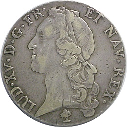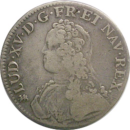 | エキュ。ルイ15世。太陽王・ルイ14世の死後、わずか5才で即位したルイ15世の幼少期の肖像が描かれています。1726年から1740年まで発行されたコインです。ナントミント。 |