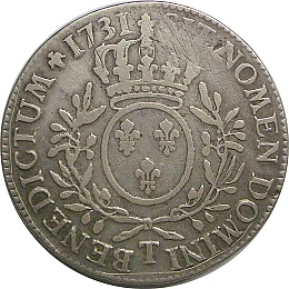 Ecu 1731 T, KM486.1, Dav1330 Obv. Louis XV, Rev. Crowned Arm & Wreath |