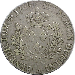 Ecu 1765 A, KM512.1, Dav1331 Obv. Louis XV, Rev. Crowned Arm & Wreath |