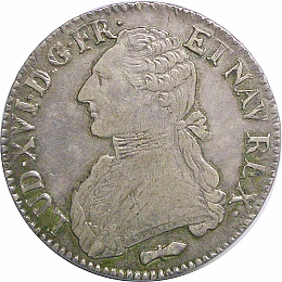| エキュ。ルイ16世。愚鈍な王と評されることが多いですが、妃マリー・アントワネットを生涯愛した心優しい王だったようです。このコインが発行された5年後、断頭台に散ってしまいました。ペルピニャンミント。 |