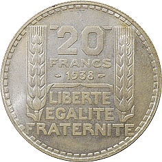 20 Francs 1938, KM879, Dav98 Obv. Liberty, Rev. Shield |