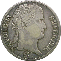 5フラン。ナポレオン皇帝、月桂冠。ナポレオン5フランの中で、最も入手しやすいタイプです。同じデザインで1815年に発行された「100日天下タイプ」は稀少です。第1帝政。パリミント。 |