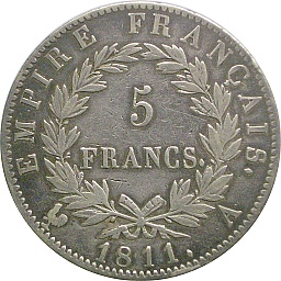5 Francs 1811 A, KM694.1, Dav85 Obv. Napoleon, Rev. Wreath |