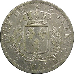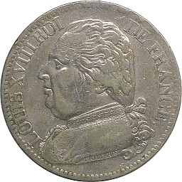 5フラン。ルイ18世。ナポレオンがワーテルローの戦いに敗れ100日天下が終わった後、再び即位したルイ18世により発行されたコインです。復古王政。リールミント。 |