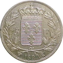 5 Francs 1822 W, KM711.13, Dav87 Obv. Louis XVIII, Rev. Crowned Arm & Wreath |