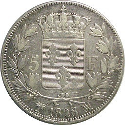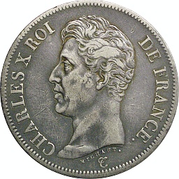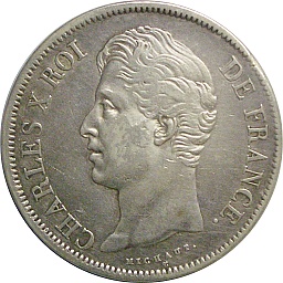 | 5フラン。シャルル10世。復古王政期の国王で、ルイ18世の弟にあたります。肖像下のデザイナー名の下に記された彫刻責任者のモノグラムが大きい前期タイプです。ラ・ロッシェルミント。 |