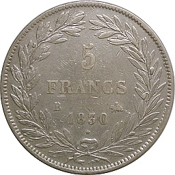 5 Francs 1830 B, KM735.2, Dav89 Obv. Louis Philippe I, Rev. Wreath |