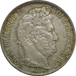 5フラン。ルイ・フィリップ1世、月桂冠。18年間、王位につきましたが、1848年の二月革命で退位し、その後、第2共和政が樹立されます。7月王政。ストラスブールミント。 |