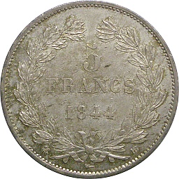 5 Francs 1844 BB, KM749.3, Dav91 Obv. Louis Philippe I, Rev. Wreath |