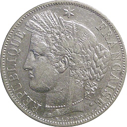 | 5フラン。セレス。普仏戦争に敗れナポレオン3世が退位した後、第3共和政が樹立され、セレスが描かれたコインが再び発行されました。裏面に自由、平等、友愛の文字が記されていないタイプです。ボルドーミント。 |