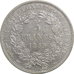 | 5フラン。セレス。ローマ神話の中の穀物の女神が描かれています。農業国フランスらしいデザインですね。共和政への移行で君主の肖像が消えました。第2共和政。パリミント。 |