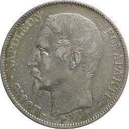 5フラン。ナポレオン3世、月桂冠。このコインは好きなデザインのひとつです。入手は比較的容易なので、機会があれば、もう少し状態のいいものを入手したいと思っています。第2帝政。ストラスブールミント。 |