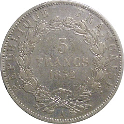 5 Francs 1852 A, KM773.1, Dav94 Obv. Louis Napoleon, Rev. Wreath |