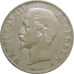 | 5フラン。ナポレオン3世皇帝、無冠タイプ。銘文が「ボナパルト」から「エンペラー」に、また裏面の図案も紋章に変わっています。第2帝政。パリミント。 |