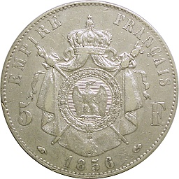 5 Francs 1856 A, KM782.1, Dav95 Obv. Napoleon III, Rev. Shield |
