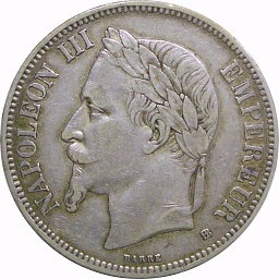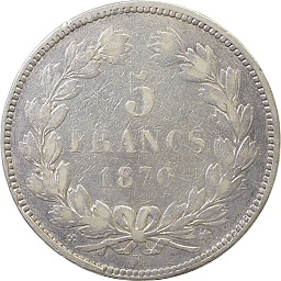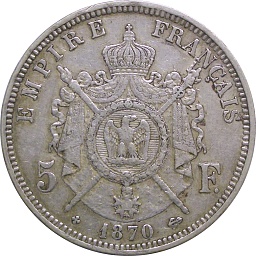 5 Francs 1870 BB, KM799.2, Dav96 Obv. Napoleon III, Rev. Shield |