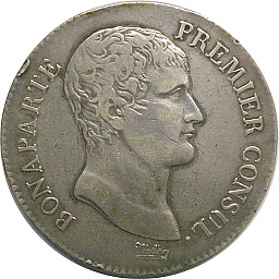 5フラン。ナポレオン第一統領。フランス革命によって樹立された第1共和政の時代に発行された5フランで、ナポレオンの肖像が最初に描かれたコインです。年銘が共和暦(AN)となっています。トゥールーズミント。 |