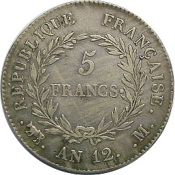 5 Francs AN12 (1803-4) M, KM659.10, Dav82 Obv. Napoleon, Rev. Wreath |