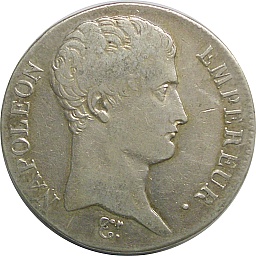 | 5フラン。ナポレオン皇帝。第1共和政から第1帝政への移行期に発行された5フランで、表面の銘文は皇帝になっていますが、裏面は共和国のままです。状態のよいものは稀少です。パリミント。 |
