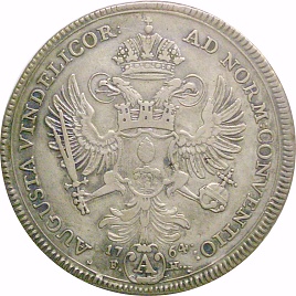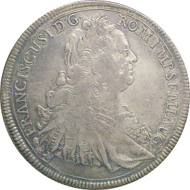 | アウグスブルク自由市・ターレル。フランツ1世。マリア・テレジアの夫で神聖ローマ帝国皇帝、フランツ1世の肖像が描かれています。アウグスブルクはローマ帝国初代皇帝アウグストスの名に由来し、ドイツの中で最も歴史の古い都市のひとつです。 |