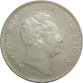 | バーデン大公国・2ターレル。レオポルド1世。発行枚数は6万枚と多くありませんが、VFクラスなら私でも何とか手が届きます。ドイツ諸邦で発行された2ターレル貨は、直径が40ミリを超え、重量も37グラムと実に立派なコインです。 |