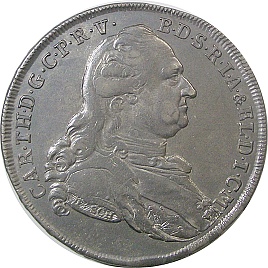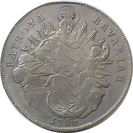 バイエルン選帝侯領・ターレル。カール・テオドール。裏面には、イエス・キリストを抱いたバイエルンの守護者・聖母マリアが描かれています。アンベルクミント。 |