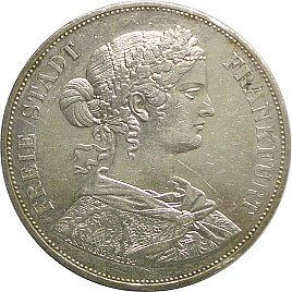 | フランクフルト自由市・2ターレル。フランコニア。表面の肖像はフランケン地方の守護女神・聖フランコニア、裏面の紋章には単頭の鷲が描かれています。フランクフルトミント。 |