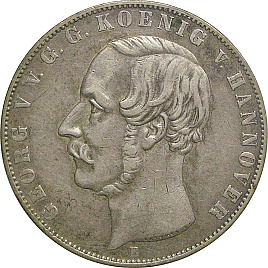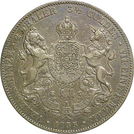 ハノーバー王国・2ターレル。ゲオルグ5世。裏面は紋章の左右に獅子(ライオン)と一角獣(ユニコーン)を配した、たいへん美しいデザインになっています。ハノーバーミント。 |