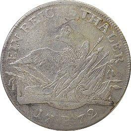 | プロイセン王国・ターレル。フリードリッヒ2世。第3代のプロイセン国王です。裏面には鷲と戦利品が描かれています。18世紀のコインですが、状態にこだわらなければ入手は容易です。ライヒスターレル。ブレスラウミント。 |
