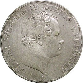 プロイセン王国・2ターレル。フリードリッヒ・ウィルヘルム4世。裏面に描かれた紋章はとても緻密なデザインで、見る者を圧倒します。この時代のドイツのコインは最も完成度が高く、ドイツコインの歴史の集大成といった感があります。ベルリンミント。 |