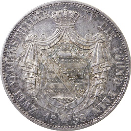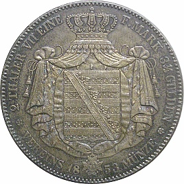Saxony 2 Thaler 1853 F, KM1149, Dav874 Obv. Friedrich August II, Rev. Shield |