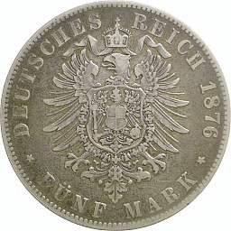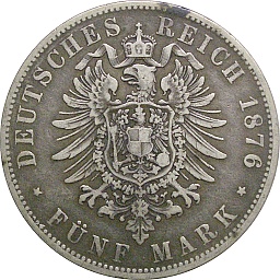 Hesse-Darmstadt 5 Mark 1876 H, KM353, Dav708 Obv. Ludwig III, Rev. Shield |