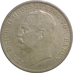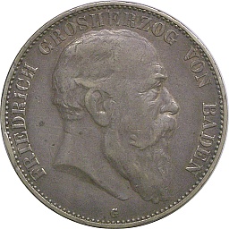 | バーデン大公国・5マルク。晩年のフリードリッヒ1世。この通常貨以外に、晩年の肖像による生誕50周年、金婚式、死去の3種類の記念貨が発行されています。カールスルーエミント。 |