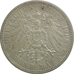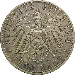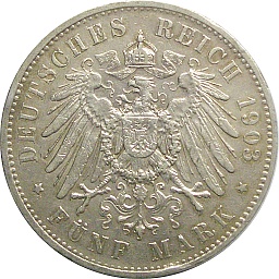 Wurttemberg 5 Mark 1908 F, KM632, Dav964 Obv. Wilhelm II, Rev. Shield |