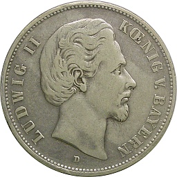 | バイエルン王国・5マルク。ルートヴィッヒ2世。彼はノイシュヴァンシュタイン城を残したことで知られます。裏面の紋章は小鷲タイプ。ミュンヘンミント。 |