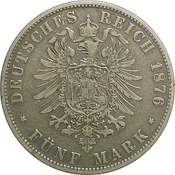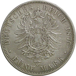 Wurttemberg 5 Mark 1876 F, KM623, Dav963 Obv. Karl, Rev. Shield |