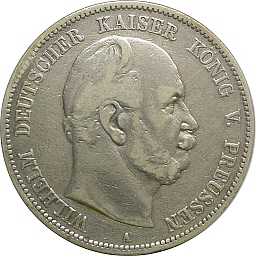 プロイセン王国・5マルク。ウィルヘルム1世。プロイセン国王であるとともに、統一後のドイツ帝国で最初に皇帝になった人物です。裏面の紋章は小鷲タイプ。ベルリンミント。 |
